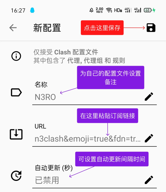 (2)复制好了Clash订阅之后打开Clash for Android应用程序。请点击配置
