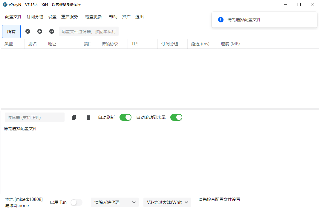 下载后解压文件,以管理员身份运行【V2rayN.exe】进入如下界面: