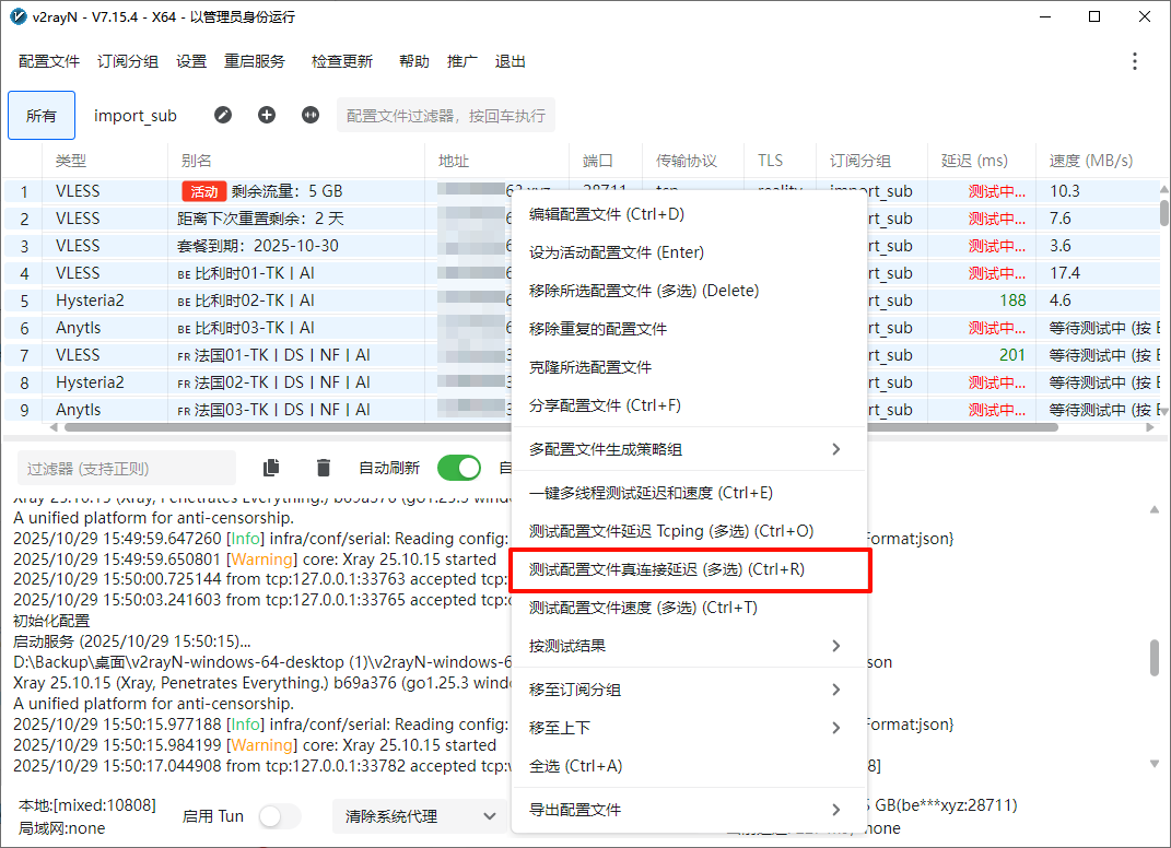 1、随便点击一个节点,按下Ctrl+A全选,然后鼠标右键,选择并点击【测试配置文件真连接延迟(多选)】