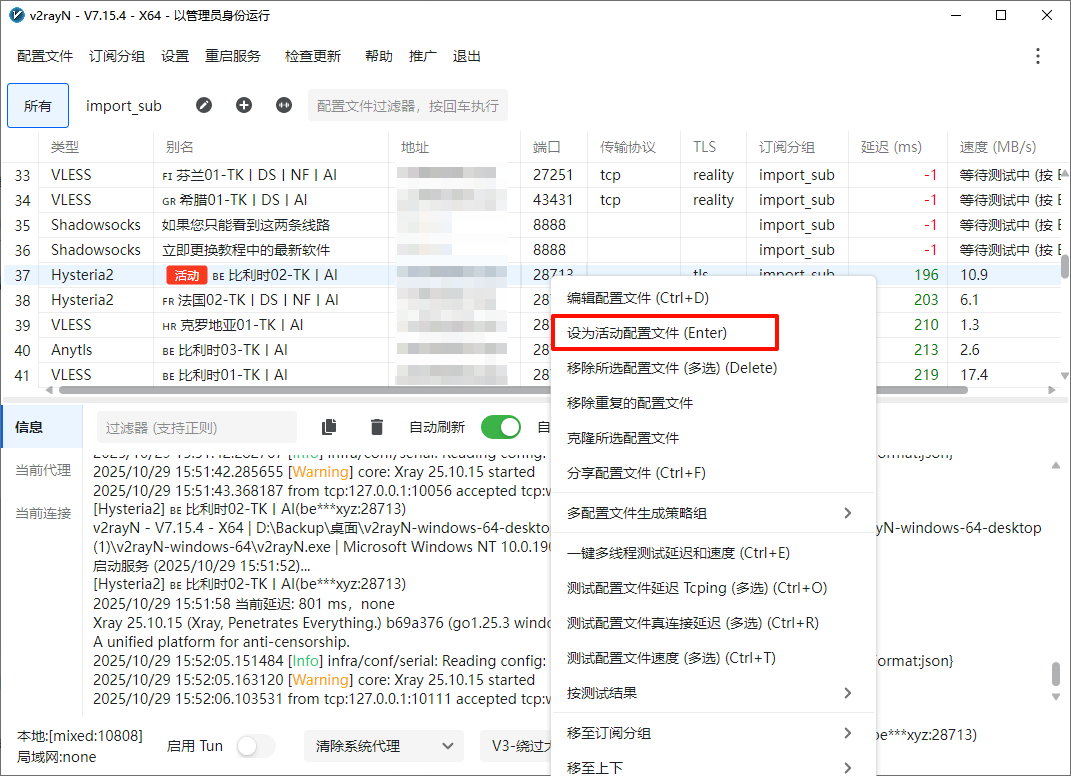 2、如果出现延迟数字,就表明节点可以使用,选择可用节点,鼠标右键,选择并点击【设为活动配置文件】