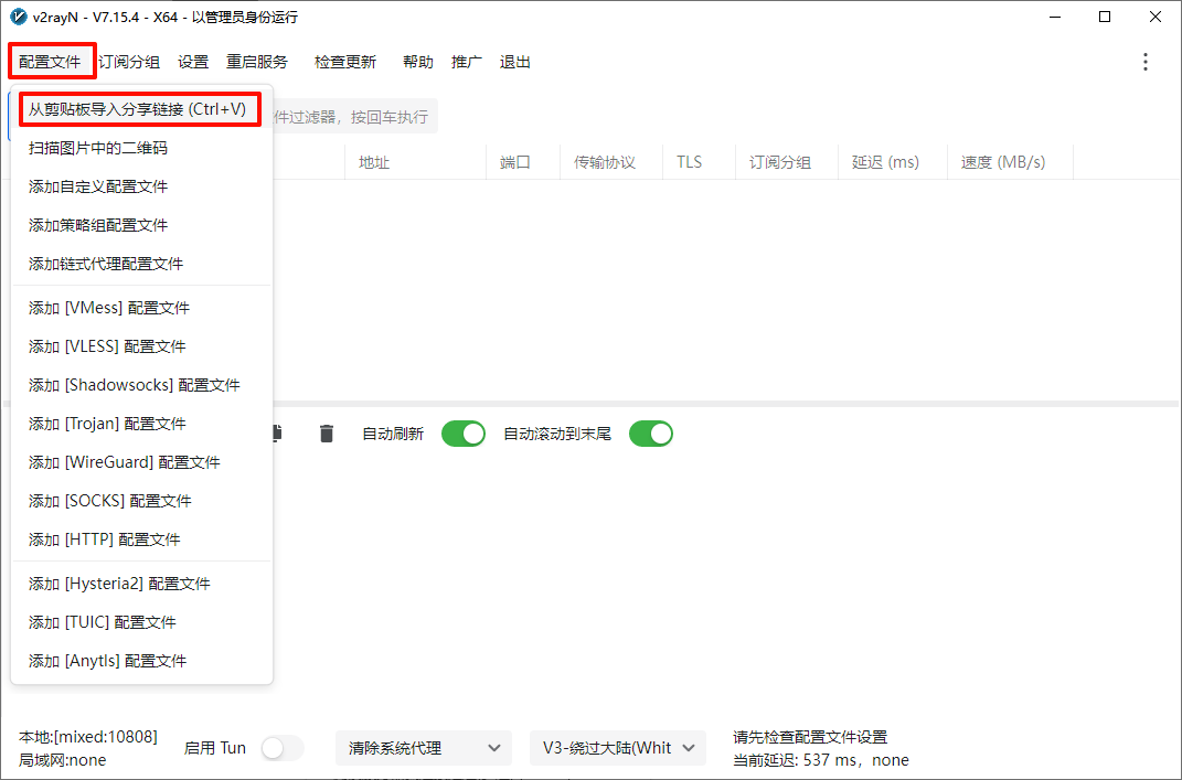 1、复制你的订阅链接,然后点击【配置文件】-【从剪贴板导入分享链接】按钮;