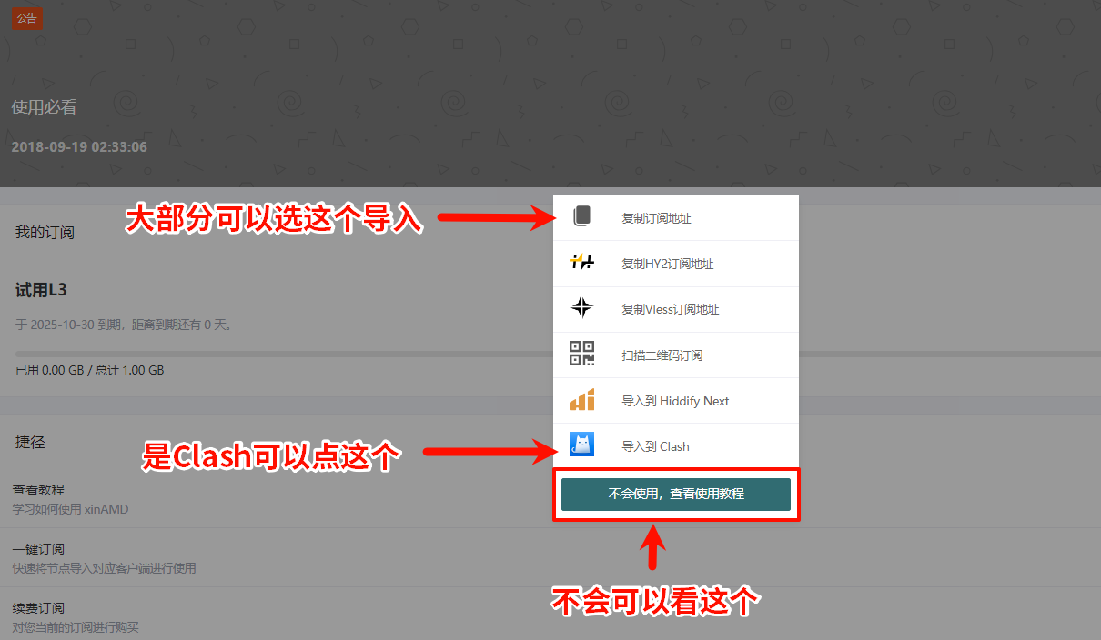 1.使用浏览器登录你购买订阅的网站【没有订阅就去买】进入个人中心,在仪表盘页面或我的订阅页面找到一键订阅按钮